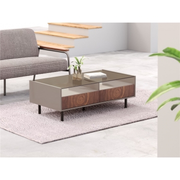 胡桃木橫截面抽面+石色亮光主體+茶色玻璃面板+黑啞光金工件