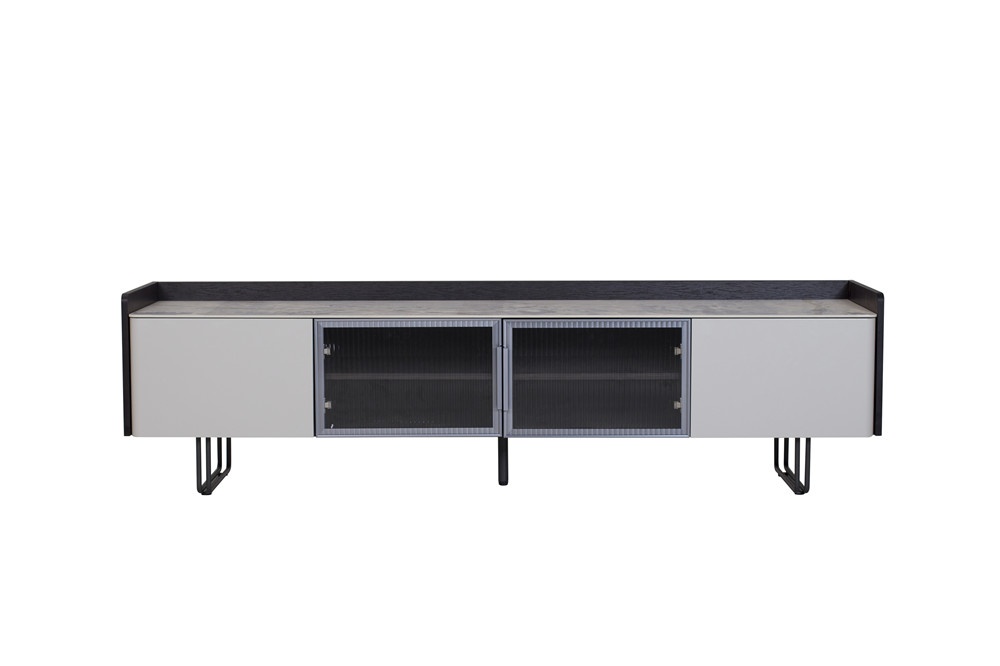 卡塔金巖板面板+煙熏木皮主體+淺駝色啞光抽面板+長虹玻璃+紳士灰門框+金屬深灰色金工腳